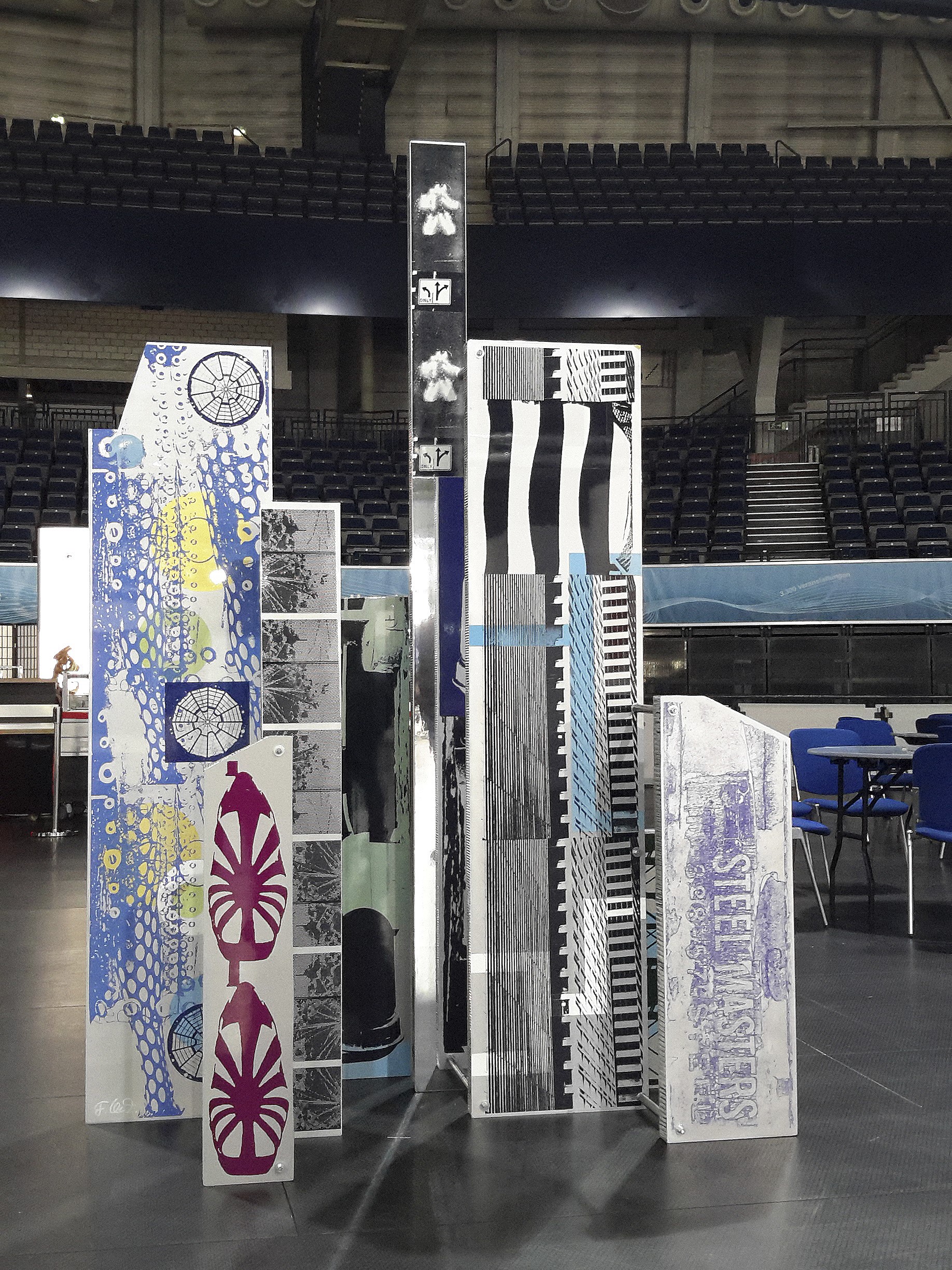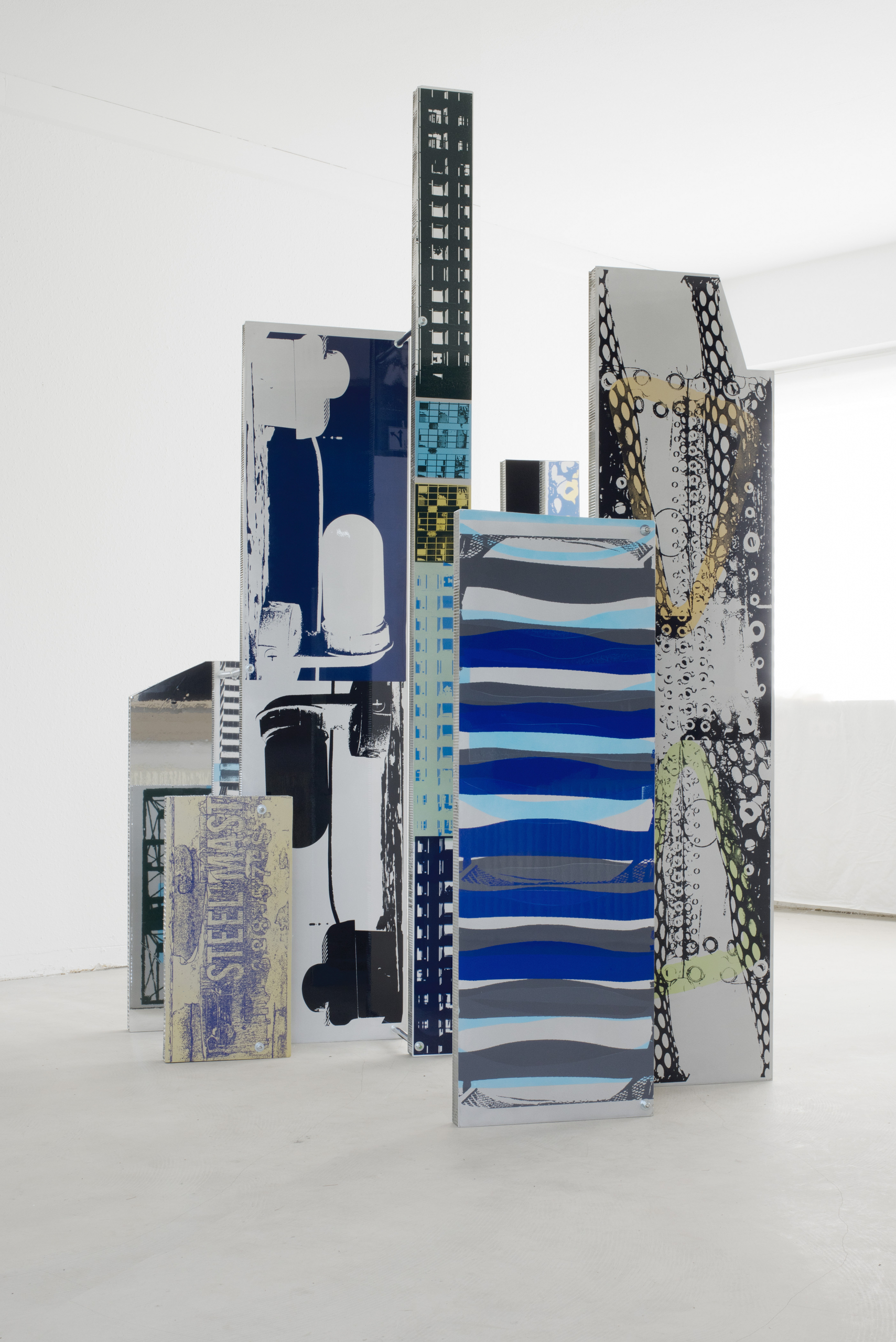 Original silkscreen, spray paint, car paint, mirror foil on 8 aluminum panels, screwed, painted from both sides, 250 x 173 x 90 cm, 98.4 x 68.1 x 35.4 in., 2016