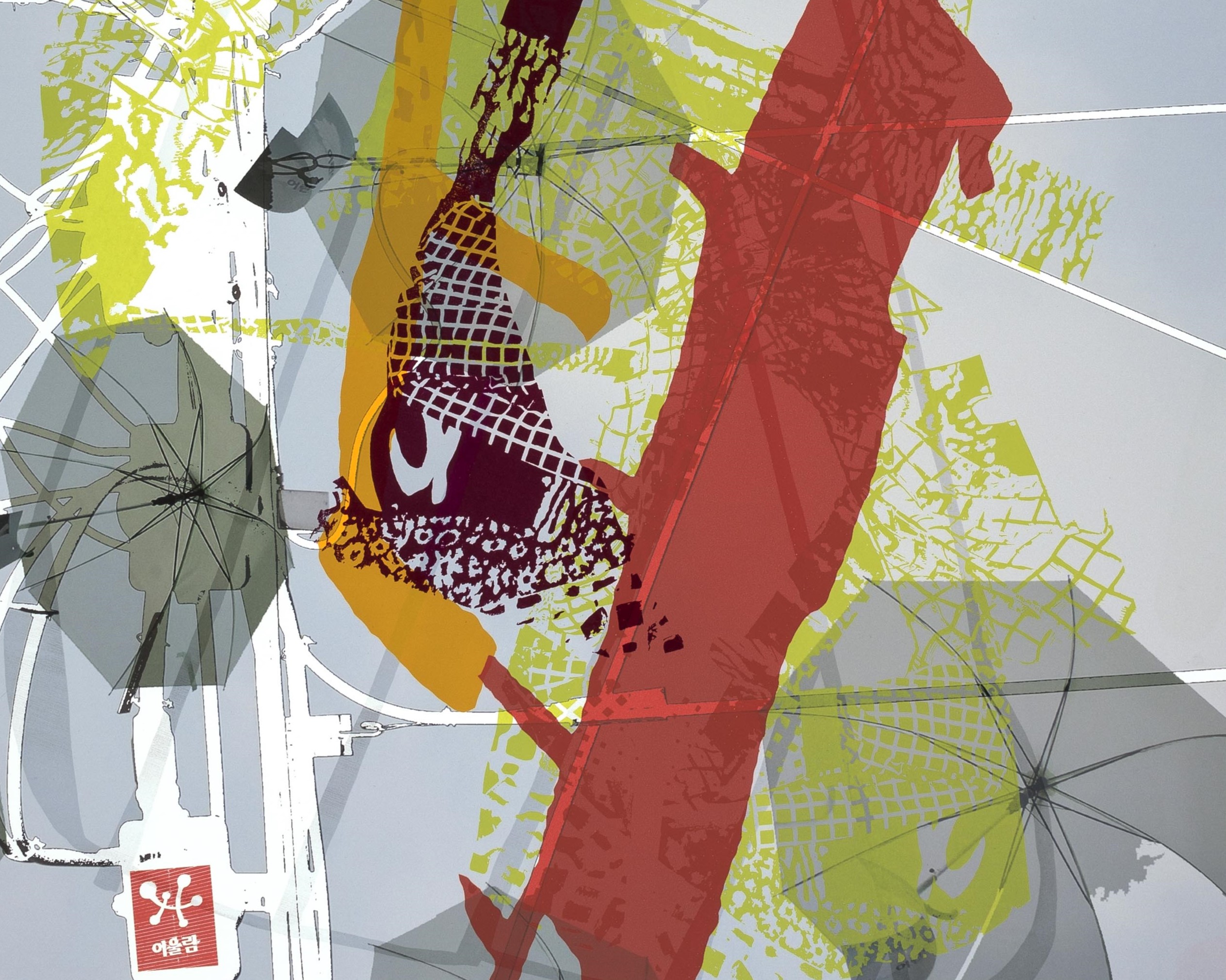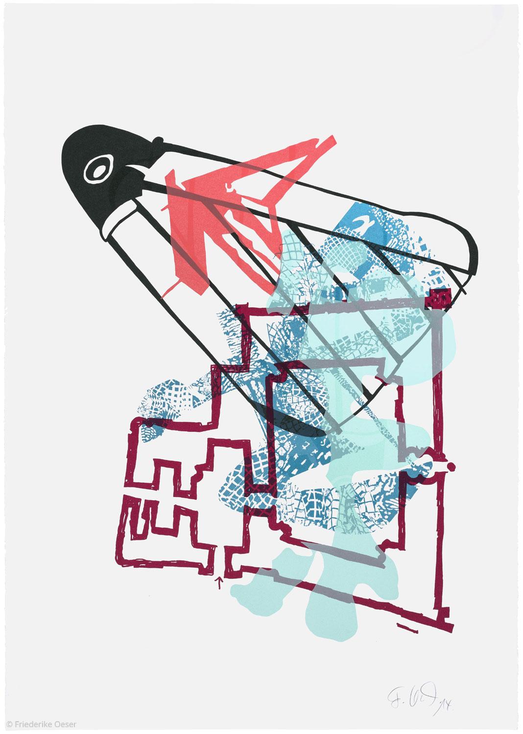Since this stencil technique is best for what I want to express (I prefer to working with a squeegee than brushes), I can use my photo-narratives to create new compositions that are predominantly an abstraction of what I have seen in reality. The result is an independent version of my initial idea.